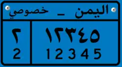Vehicle registration plates of Yemen entered regular usage in 1993. The current version started in 2018 used FE-Schrift typeface for alphanumeric and Square Kufic typeface for Arabic text.[1]