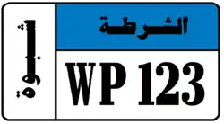 Starting from February 2020, Shabwah Governorate joined with Hadhramaut Governorate in issuing license plates in this new format and appearance. Similar to Hadhramaut, Shabwah License Plates consist of black text and black boundary on white background. Shabwah Governorate plates consist of the governorate name in Arabic (شبوة) and a 4 digit number. Shabwah Governorate plates also have a strip on the left hand side with the letter W in black on a background whose color depends on the classification of the vehicle. Temporary plates have a strip on the right hand side that says "مؤقت", meaning temporary, on a blue background. The license plates for Shabwah use a unique serif font.[7]