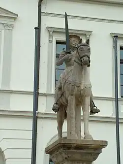 Equestrian Roland statue showing Roland astride Veillantif in Haldensleben, Saxony-Anhalt, Germany, in front of the town hall.