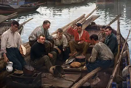 Beginning in 1892, he was a frequent participant in the National Exhibition of Fine Arts. He received an honorable mention in 1895 for "In the Studio". Two years later, he was awarded a Third Class prize for "¡Todo a babor"! (Hard to Port!). This was followed in 1899 by another Third Class prize for "La rifa de la ternera" (The Veal Raffle), During these years, he also provided illustrations for Blanco y Negro.[1]