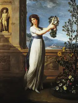 The myrtle continued to represent marital/martial Venus in the Classical tradition: in Andrea Appiani's Joséphine Bonaparte Crowning a Myrtle Tree (1796), painted soon after her marriage and the Battle of Lodi, the wife of Napoleon adorns a myrtle tree with a wreath that mingles the flowers of Venus with the laurel and oak of a conqueror, in a classicizing setting[235]