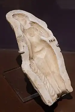 The Venus Pudica statuary type displays the goddess naked, and the placement of her hands is not obviously defensive but rather instructs the viewer toward the erogenous zones of the female body.[279][280][281] The sometime presence of a cloth or drapery is ambiguous as to whether Pudica has just removed her garment or is about to put it on, and in some versions, such as the Mazarin Venus (at the top of this article), suggests a striptease.[282] The ancient calendars that illustrate April with a statue of Venus show her in the pudica or anadyomene poses.[283] The apparent erasure of social rank in emulating the nude Venus was renegotiated by the practice of wearing jewellery in the baths, as modeled by the bejewelling of these nude statues and documented by archaeological finds in the drains.[284]