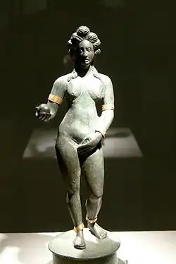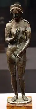 Bronze statuettes of a diademed Venus with the loose locks of the Anadyomene type: at left, jewelled from Baalbek, Roman Africa (1st–2nd century AD); at right, a pudica pose (ca. 150 AD, National Archaeological Museum, Florence)