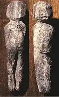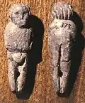 Four of them are made of ivory and one of them is made of serpentine.[1] One of the figurines (pictured) made of ivory depicts a shrouded person. A similar shrouded figurine has been found from Mal'ta. Carvings on the figurine might represent decorated clothes. The figurine is partially sexually ambiguous due to lack of breasts, but it has an emphasized pubic triangle and vaginal area.[5]
