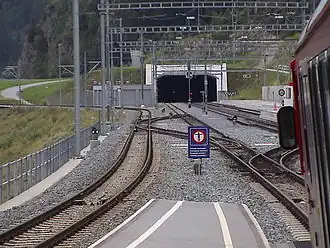 Service is based on hourly regional trains between Scuol-Tarasp and Chur, complemented every 30 minutes by car shuttle trains transporting road vehicles between the two valleys linked via the tunnel and by freight trains. The tunnel is single track, with passing loops (each 2 km (1.2 mi) long) in the middle and near the two portals. Electrification is the RhB overhead standard of 11 kV 16.7 Hz AC. Due to its length, the spatial effects of the Vereina Tunnel have been subject to studies.[7] Since its completion, multiple safety-related modifications to the tunnel have been performed, largely due to changes in standards that have elevated safety requirements.[8] During the 2010s, the Zurich Electricity Works established a district-heating network adjacent to the tunnel that primarily uses water drawn from area around the north portal for geothermal energy.[9]