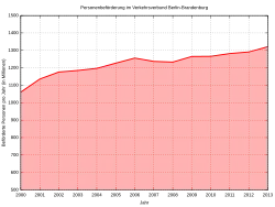 The Verkehrsverbund Berlin-Brandenburg (VBB) is a transport association run by public transport providers in the German states of Berlin and Brandenburg. It is a private limited company owned jointly by the states of Berlin and Brandenburg (with one third each) and the 18 districts and district-free cities of Brandenburg with 1.85% each. It was founded on 30 December 1996. VBB claims to be one of the largest transport associations in Europe based on the area covered of 30,367 km2 with nearly 6 million inhabitants.[1] Common ticketing was launched on 1 April 1999. The 2005 number of passengers transported was 1.23 billion, with 3.37 million passengers per day.[2]: p:27