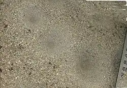 Pit traps of a larva of the wormlion Leptynoma sericea; the outline of the larva on its back under the sand is faintly visible, in contrast to most pit-digging antlions