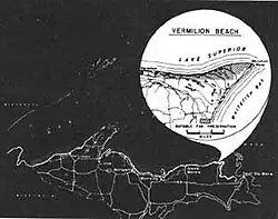Vermilion was named for the nearby vermilion deposits used by the Native Americans for paint.[3] There is no evidence that Native Americans permanently settled at Vermilion but it was a popular stopover for Native Americans, Voyageurs, Coureur des bois, trappers, and anyone who traveled the south shore of Lake Superior. Jesuit missionaries were probably the first Europeans to stop at Vermilion in the 17th century.[2] Territorial governor Lewis Cass and geologist and Indian Agent Henry Schoolcraft passed through Vermilion Point with a party of 44 in 1820 on an official expedition along the south shore of Lake Superior. Henry Schoolcraft took overnight shelter from a storm at Vermilion in 1831 when leading a party to vaccinate Native Americans.[3]
