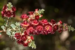The flowers are arranged in spikes along the branches, opening in sequence from the lowest flowers, each flower on a stalk about 1 mm (0.04 in) long. The floral cup is top-shaped, 3.5 mm (0.1 in) long, glabrous and slightly rough with green appendages about 1 mm (0.04 in) long. The sepals are a deep maroon colour, spreading, 4–5 mm (0.16–0.20 in) long and have 8 or 9 feathery lobes and two large, hairy, ear-like appendages. The petals are a similar colour, erect, 5 mm (0.2 in) long, 3.5 mm (0.1 in) wide with a fringe a further 2 mm (0.08 in) and also have small, hairy, ear-like appendages. The style is 7 mm (0.3 in) long, curved, and densely hairy near the tip. Flowering time is from September to January.[2]