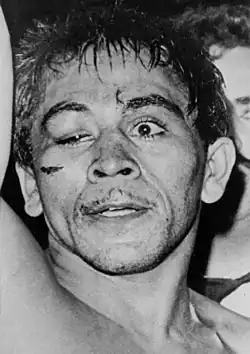 Vicente Samuel Saldívar García (May 3, 1943 – July 18, 1985) was a Mexican professional boxer who competed between 1961 and 1973. He was a two-time featherweight champion, having held the WBA, WBC, and The Ring titles from 1964 until his retirement in 1967. He came back and once again held the WBC and The Ring titles in 1970. Saldivar has frequently been ranked amongst the greatest in the history of that division by many noted boxing historians and critics.[1] He currently holds the record for the most wins in unified featherweight title bouts and the longest unified featherweight championship reign in boxing history at 8 title bouts and 7 title defenses respectively. Saldívar fought in front of the fourth largest crowd ever, 90,000 in Estadio Azteca, and has also regularly been cited as one of the finest left-handed fighters of all time.[2]