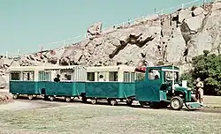 From the beginning of the 1900s George Honeyman contracted with the SAR to operate the passenger service. From 1940 his younger brother, Frank, took over until the line was closed in 1955 when the old working jetty and remnants of the Victoria Pier were being demolished by the Harbours Board. To strengthen the causeway for operation of the tram would have cost £3,000 but funds were not forthcoming and in 1954 the causeway was reconstructed without rails. The service continued to operate on Granite Island itself until 1956, when the cars were disposed of. Between 1956 and 1986 two rubber-tyred trailers towed by a small Ferguson tractor, later by a Land Rover with cladding to imitate the outline of a steam locomotive, provided a service with half the 32-person seating capacity of the tram cars.[3]