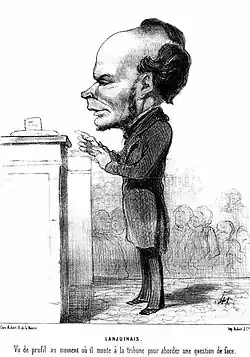 On 17 February 1838 Victor Lanjuinais was elected deputy for the third college of Loire-Inférieure (Pont-Rousseau). He sat on the center-left. He was reelected in March 1839, July 1842 and August 1846.[1] He was a correspondent of the liberal thinker Alexis de Tocqueville.[7] Lanjuinais belonged to a small group of deputies who followed Tocqueville in supporting the Orleans monarchy while agitating for democratic reforms.[8] He was moderately opposed to the policy of François Guizot, and voted for the electoral reform proposal in 1847, but refused to join the Campagne des banquets (banquet campaign).[1]