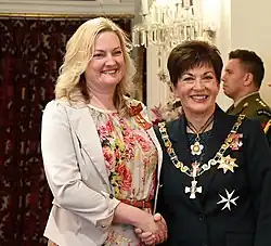 Spackman (left) in 2016, after her investiture as an Officer of the New Zealand Order of Merit by the governor-general, Dame Patsy Reddy