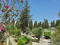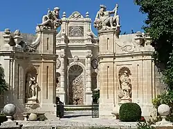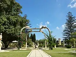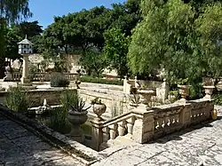 The Baroque Garden is the old garden of the villa, laid out at the time of the construction of the villa in the 18th century. These gardens are typical of the Baroque in Italy at that time, with a symmetrical layout set around cobbled pavements with pillars bearing stone pots of all kinds. The garden was originally planted with all sorts of citrus trees, especially orange trees. Later on, especially during the days of Lord Strickland, lawns were added and exotic trees, including palm trees, as well as other types of fruit trees were planted. Flowering shrubs and creepers were likewise added to this garden. Of particular interest are the large Nymphaeum and the small one, as well as the Baroque Gateway that frames the large Nymphaeum as one looks through it towards the west.[28]