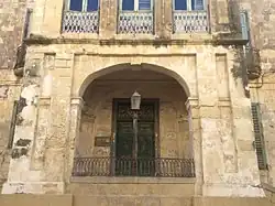 The villa is found just outside the outskirts[32] and suburb[33] of Valletta in the hamlet of Guardamangia[34] set just at the crest[35] in a quiet residential area[36] in a narrow street.[37] The villa is described as built in the form of a palace complemented with sea views over Marsamxett Harbour.[38] The Queen describes it as a "town house".[10] It is a typical traditional Maltese residence.[9] The building is built with limestone, known as sandstone and described by the Queen as "yellow stone",[10] and designed with spacious interiors.[39] The house has two entrances with one set at street level and another set after going up a flight of stairs under an elaborate front porch.[10] The royal family had taken their own personal belongings from Britain when they lived at the villa[40] allowing them to live in a lavish residence,[41] in a once-elegant home.[33] The royal family had British servants at the villa.[42]