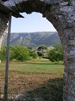 The earliest document attesting to the monastery dates from the 10th century and describes the foundation of the monastery by three nobles from Anagni.[7] A series of very interesting charters and trials from the eleventh through 13th century speak to a small rural monastery with properties in the area of the original fundus, which despite its meagre size and income managed to become embroiled in regional and papal politics of the central Middle Ages, culminating in the suppression of the monastery in 1297 by Pope Boniface VIII. After the death of the monastery, the village remained at least for a little while, however, as it is referred to as a castrum in 1301 and 1333, and a castrum dirutum in 1478.[8] The castrum walls and church are still standing today.