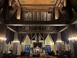 Built in 1928 at a cost of $2.75 million,[2] the Villa Riviera is a 16-story French Gothic Building. The steel-framed[3] structure is topped with a steeply pitched verdigris copper roof. The building was designed by architect Richard D. King who won a grand prize at an international contest for the design that he referred to as "Tudor Gothic."[3][4][5] The structure features fierce-looking grotesques perched along the ridges of the higher floors. The four styles of grotesques are: a bear holding a shield, a cougar, an eagle, and a winged chimera featuring a wolf's head and a bird's body. They adorn each uppermost corner of the building and both sides of the 16th floor balconies overlooking the city and ocean. The building was also equipped with luxurious features, including a roof garden, the "Umbrella Room" lobby, high-speed elevators, "vacuum-type steam heating," and a 100-car garage replete with car elevator to aid the staff valets. There was a private beach and food stand for the residents and their guests to enjoy.[2]