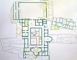 The nucleus of the later villa consists of a peristyle surrounded by residential rooms, typical of the late Roman villa. The most representative rooms are, on the west wing, the particularly large Aula Absidata ("apse hall") which recalls the Piazza Armerina basilica, and on the south wing a tri-apsidal room where the peristyle overlooked the sea. The Aula Absidata contained a mosaic floor now destroyed, but the mosaic floors of the peristyle and tri-apse are in excellent condition.[4] The east–west orientation of the Aula Absidata, different from the north–south axis of the peristyle, raises doubts about its function and dating, suggesting that it might have been a church built after the owner had converted to Christianity.