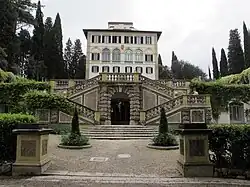 For a short period it was owned by the Italian tenor Giovanni Matteo Mario and his wife Giulia Grisi, the transaction was completed by financier N M Rothschild of London, then in 1871 the villa was purchased by Pietro Pagliano, who added a medievalizing crenellated tower, but a new, more sympathetic owner, the American Phelps Thomas, took ownership in 1882 and began a programme of free restoration and aggrandisement, to designs of the antiquarian architect Corinto Corinti (1843–1930).[3] A large central staircase was added and grand cinquecento portals. He reduced the tower, designed a new vaulted porte-cochere for carriages, overhung by a garden, which still exist, and remodelled the park by adding an Italian terraced garden and conservatories, with a pergola that Penelope Hobhouse found to resemble the wooden frames shown in woodcuts for Francesco Colonna's Hypnerotomachia Poliphili.[4] Augusto Bruschi was entrusted with decorative painting, covering walls with medieval and neo-cinquecento patterns.[1] After a sale of its contents in 1891[5] the villa passed into the hands of the Carrega di Lucedio family and then, in 1911,[6] to the art critic, journalist and founder of the art magazine Il Dedalo, Ugo Ojetti and his wife Fernanda,[7] who undertook further structural remodeling, removing many of the 19th century accretions, and installing an extensive library and many paintings and sculptures.[8] From 1973 to 1987 the Villa Il Salviatino housed Stanford University's overseas program Stanford in Italy with classrooms, offices, library, dining facilities, and students' rooms.[9]
