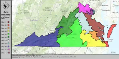 Virginia is currently divided into 11 congressional districts, each represented by a member of the United States House of Representatives.