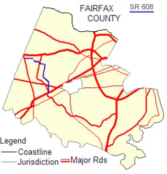 State Route 608 (SR 608) in Fairfax County, Virginia is a secondary state highway which traverses the western portion of the county.[1] Before the Fairfax County Parkway from US 29 to Reston was complete, SR 608 was the main north–south road in western Fairfax County.