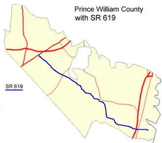 State Route 619 in Prince William County, Virginia is a secondary state highway. SR 619 provides a cross-county connector as well as a major artery for commuters. SR 619 is known by four names: Linton Hall Road, Bristow Road, Joplin Road, and Fuller Heights Road. There are also two short concurrencies: one with SR 234 Old in Independent Hill, and one with Fuller Military Road on the border of Marine Corps Base Quantico.