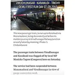 Virudhunagar Junction railway station (station code: VPT) is an NSG–3 category Indian railway station in Madurai railway division of Southern Railway zone.[1] It serves the town of Virudhunagar, located in Virudhunagar district of the Indian state of Tamil Nadu.[2] It is being developed under Amrit Bharat Station Scheme.