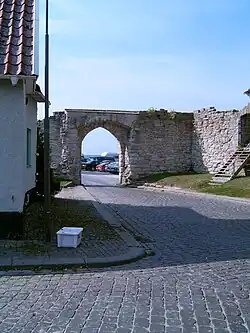 Lübeckerbräschen is the name of a partially collapsed section of the northern wall. It is possible that it was here that Lübeck forces assaulted the town in 1525. A number of arrowheads have been found here during archaeological excavations. At the time of the assault, a significant part of Visby was burnt to the ground, and churches and monasteries plundered. Many of these were never rebuilt and as of 2014, Visby hosts a large number of church ruins. Recent research indicates that the collapse of the wall was unconnected to the assault in 1525; but the location may coincide with the place of the attack.[13] On the razed part of the wall, there was a small tower riding on the wall which, when it collapsed, pulled a substantial part of the wall down with it. That part of the wall was erected on unstable ground and this may have caused the foundation of the wall to move, prompting the collapse.[18] | |