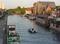 The inland shipping route Vistula-Oder competed economically with the sea route through Gdańsk, taking over most of the transport of timber from Russia and the Kingdom of Poland to the German Empire. The peak of freight transport was recorded in the first decade of the 20th century.[note 2] Between 1903 and 1907, an average of 3,585 boats and steamboats passed through the route each year, transporting 253,000 tons of goods and 43,200 rafts with 441,000 tons of timber.[11] After 1920, the waterway was divided by the political border between Poland and Germany, which had a negative impact on the volume of cargo shipping. The waterway became entirely within Poland's borders after 1945. The economic importance of the route declined after 1980, but since the 1990s, its tourist significance has been growing.