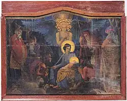 Artistic activity slowed down after World War II arrived in Singapore, with works reflecting artist's varied experiences of the war.[1] Richard Walker's Epiphany (1942) was likely painted as a makeshift altarpiece in Changi Prison during the artist's internment there during the war.[25] It is an oil painting that depicts the Virgin Mary as an Asian woman, suggesting the universality of Christian religious values.[25]