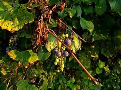 Some V. riparia vines have been known to withstand temperatures as low as −57 °C (−71 °F).[5] The foliage is typically resistant to mildew and black rot, and the roots resistant to phylloxera. The berries, however, are often sensitive to mildew and black rot if the vine is exposed to prolonged wet and humid conditions.