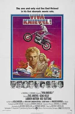 Viva Knievel! is a 1977 American action film directed by Gordon Douglas and starring Evel Knievel (as himself), Gene Kelly and Lauren Hutton, with an ensemble supporting cast including Red Buttons, Leslie Nielsen, Cameron Mitchell, Frank Gifford, Dabney Coleman and Marjoe Gortner.[2]