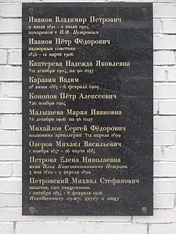 Vladimir Ivanovich was buried in the Smolensky Orthodox Cemetery, his grave was lost over time,[4] but in the 2010s the search group Memorial, Educational and Historical and Cultural Center "Beloye Delo" located his grave on Straight Track, plot 173;[5] next to the grave of his wife Elena Konstantinovna.[3] In 2017, the Saitov's family burial was restored by the Sobor Limited Liability Company, and in December of the same year, a funeral service was served at their graves by Archpriests Igor Yesipov and John of Moscow.[3]