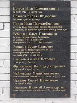 Basic information about the Bogoslovskoe Cemetery (first board) Noteworthy pre-revolutionary burials; compiled by Vladimir Ivanovich Saitov (second board) List of pre-revolutionary burials; continued (third board) List of pre-revolutionary burials; continued (fourth board) The list of the dead on February 28, 1875, during the explosion in the artillery laboratory (fifth board)