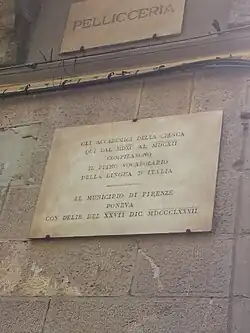 Stone plaque commemorating the first Vocabolario in via Pellicceria, Florence, near the Palazzo di Parte Guelfa
