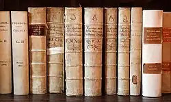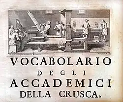In 1583 the Accademia della Crusca was founded in Florence with the aim of codifying the Tuscan dialect and producing a comprehensive dictionary, drawing mainly on the lexicon of canonical literary texts from Florentine authors of the 'golden age' in the fourteenth century, such as Dante, Petrarca and Boccaccio.[1] Work on the Vocabolario was begun in 1591 thanks to Lionardo Salviati's interest in philology. His search for words extended beyond the published works of great writers to include the unedited manuscript texts held in the collections of the various Florentine academies;[2] he also compiled usage from writers after the golden age, including Lorenzo de' Medici, Francesco Berni, Niccolò Machiavelli, and, indeed, from his own writing. He also drew on non-Florentine sources such as Pietro Bembo and Ludovico Ariosto.[3] The work was edited entirely in Florence – eventually, thirty six academicians were working full time on it – although the printing was done in Venice under the supervision of the Accademia's secretary, it:Bastiano de' Rossi.[4]