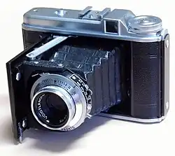 The initial Bessa cameras (1929–30) took 6×9 cm frames on 120 film and used a waist-level finder; a button was used to release the front, which folded down and allowed the lens to extend. These were succeeded by improved versions that added a folding frame finder (1930–35) and dual-format capability (1932–33, 3.4×5.5 cm; then 1935–37, 4.5×6 cm).[9] The 1935 model was the basis for the Bessa Rangefinder, which added improved lenses and a coupled rangefinder to assist in setting focus.[10] Detail improvements were applied to later models, including the removal of the waist-level finder (1942) before production was suspended for World War II. After the war, production resumed until the late 1940s.[9]