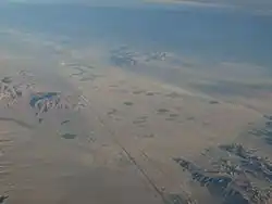 Aerial view of the Newberry Springs area, looking northwest. Volcano House is in the bottom right corner, an isolated white-topped cinder cone, just above the mountain ranges.