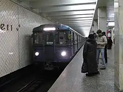 Volgogradsky Prospekt (Russian: Волгоградский проспект) is a Moscow Metro station in the Nizhegorodsky District, South-Eastern Administrative Okrug, Moscow. It is on the Tagansko-Krasnopresnenskaya Line, between Proletarskaya and Kuzminki stations. Volgogradsky Prospekt was opened on 31 December 1966 as part of the Zhadovsky radius and is named after the nearby Avenue that leads on from the centre of Moscow into an intercity highway all the way to the southwest of Russia, although not directly to Volgograd. The station was built to a slight modification of the standard 1960s pillar-trispan decoration showing the first signs of innovative design, as architects V. Polikarpova and A. Marova did. The platform is narrowed (as the station was never designed to carry large passenger crowds). The white ceramic tiles on the walls are arranged on 45 degrees to the platform and are decorated with metallic artworks out of anodized aluminium depicting the Battle of Stalingrad (artist E. Ladygin). The pillars are faced with white marble whilst the floor with grey granite. The station has two underground vestibules with glazed concrete pavilions which allow passengers access to the Talalikhin and Novostapovskaya streets as well as directly to the AZLK automobile plant.