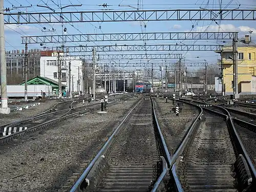 Volkovskaya (Волковская) railway station is a nodal railway station within Saint Petersburg railway system in Russia. It was created in 1900 in a historical location on the crossroads of several important railway lines ascending to initial formation of the whole Russia's railway network, where the Connecting Line and Putilovskaya Line had a joint section.