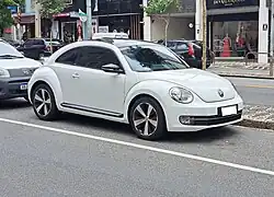The Volkswagen Beetle, also sold as the Volkswagen Käfer, Volkswagen Coccinelle, Volkswagen Maggiolino, and Volkswagen Fusca in some countries, is a compact car marketed by Volkswagen introduced in 2011 for the 2012 model year, as the successor to the Volkswagen New Beetle launched in 1997. It features a lower profile while retaining an overall shape homaging the original Volkswagen Type 1 Beetle. One of Volkswagen's goals with the model was to give it a more aggressive appearance while giving it some stylistic aspects reminiscent of the Type 1.[2][3] This was an attempt to distance the new model from the New Beetle, produced from 1997 to 2011, which never approached the success of the original Beetle.[4]