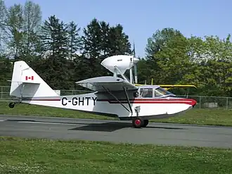 The VJ-22 is a high-winged monoplane, using the wings from an Aeronca Champion or Chief, with a new flying boat hull of mahogany plywood, waterproofed with fiberglass cloth.[3] The aircraft's single engine, normally a pusher of between 85 hp (63 kW) and 100 hp (75 kW), is mounted on pylons above the wing centre section. The engine can also be mounted in tractor configuration and engines of up to 135 hp (101 kW) have been used successfully. A retractable tailwheel undercarriage is provided. The pilot and passenger sit side by side under an enclosed canopy, and are provided with dual controls.[1][2][4]