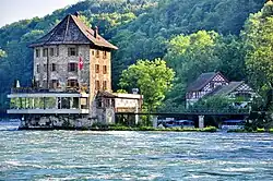 The water castle is located in the plunge pool of the Rhine Falls (Rheinfall), built on a small island in the Rhine river in the municipality of Neuhausen am Rheinfall in the canton of Schaffhausen, opposite of the Laufen Castle in the canton of Zurich. The Schlössli (twee for German Schloss, meaning 'castle') owes its name to the location on a small island, washed by the water of the Rhine Falls, which used to be known as Werd, meaning literally a river island.[1]