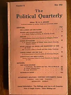 During 1913 Adams made arrangements with the Oxford University Press for publication of a quarterly journal "devoted to every branch of political science, from the reviewing of its literature to the criticism of current affairs".[26] The first issue of the Political Quarterly appeared in February 1914, many copies from its print-run of 3,000 being sent to North America.[27]