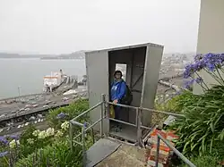 Wellington had a tramway system between 1878 and 1964. Wadestown was part of the network from 1911. The narrow and steep cutting that forms part of Lennel Road between Barnard Street and Sefton street was specifically created for the tramway.[18] In c. 1918 a tram shelter was built on the corner of Sefton Street and Hosking Lane/Lennel Road. It continues to be used as a bus shelter and is preserved for its architectural and historic value.[19] The Wadestown tram line was closed in 1949 and replaced by a bus service.[20][19]