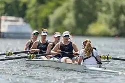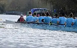 The earliest surviving record of the boat club's existence are accounts for 1837, although evidence suggests it was founded during the early 1830s.[1] Wadham competed in the first Grand Challenge Cup in 1839, losing to Trinity College, Cambridge.[2] In 1849, Wadham competed against Trinity and Oriel College, Oxford in the Ladies' Challenge Plate and the Grand Challenge Cup. Wadham won both races with Trinity coming in second.[1] It is said this victory led to Wadham's right to use Cambridge's blue-green for first VIII colours instead of its traditional light blue,[2] although this is debated.[1]