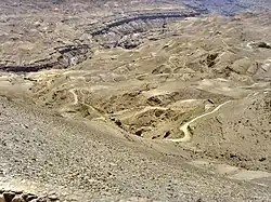 The Mujib Reserve of Wadi Mujib is located in the mountainous landscape to the east of the Dead Sea, in the southern part of Jordan valley, approximately 90 kilometres (56 mi) south of Amman. A 212 km2 (82 sq mi) reserve was created in 1987 by the Royal Society for the Conservation of Nature and is regionally and internationally important, particularly for the bird life that the reserve supports.[3] In 2011, UNESCO declared Mujib biosphere reserve.[1] It extends to the Kerak and Madaba mountains to the north and south, reaching 1,277 metres (4,190 ft) above sea level in some places. This 1,708-metre (5,604 ft) variation in elevation of its drainage basin, combined with the valley's year round water flow from seven tributaries, means that Wadi Mujib enjoys magnificent biodiversity that is still being explored and documented.[4] The reserve consists of mountainous, rocky, and sparsely vegetated desert (up to 800 metres (2,600 ft)), with cliffs and gorges cutting through plateaus. Perennial, spring-fed streams flow to the shores of the Dead Sea.