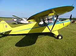 The introductory model was displayed with a contrasting paint scheme, one half painted green with a yellow stripe, and the other half painted yellow with a green stripe. This unusual "court jester" paint scheme was used to differentiate the prototype from the standard yellow scheme used on the Piper Cub, for marketing purposes.[9] Paul Poberezny became the first customer to build a CUBy.[6] Poberezny's aircraft became part of the EAA AirVenture Museum Foundation[10] and was used to demonstrate the use of automotive fuel in aircraft engines for the Experimental Aircraft Association.[11] The designer of the aircraft Dick Wagner flew the unpressurized aircraft as high as 20,000 ft (6,096 m) to demonstrate that auto fuel would not cause vapor lock.[12]