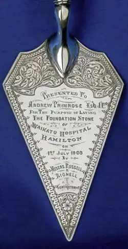 The foundation stone of the first ward of the hospital to be built in brick was laid on 1 July 1905 by Andrew Primrose, Esq., J.P.[12] The decision to expand the hospital had been made the previous year by the Waikato District Hospital and Charitable Aid Board (of which Andrew Primrose was a member since its institution) since the demand for admission had more than three times outgrown the accommodation.[13] During the ceremony to lay the foundation stone Primrose was presented with a silver trowel (which was on display prior to the ceremony in the window of a shop owned by a Mr. Howden[12]) which was engraved with the inscription: