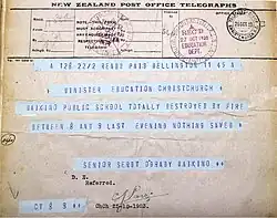 The funeral procession for the two victims was one of the largest ever seen in the area.[1] Classes resumed on 5 November, operated out of a local hall.[1] After the shooting, a protest was held on 24 October[1] against the reopening of the school (and the positioning of the school, as it was considered by the locals to be too isolated).[3][2] During the meeting, someone entered and announced that the school was on fire. By 9 p.m., the school was almost entirely destroyed.[3][2] A second Waikino School was built in a different location in 1925.[6] The identities of the people responsible were kept hidden by the community and no one was ever charged or arrested for the fire,[3] though one of the men thought to be involved in the burning of the school later became the caretaker of the second Waikino School, built further down the hill.[3][2] A report by The New Zealand Herald stated that the arson was thought to be due to the shooting and the location of the school, with some residents stating the day of the shooting that "they would not be sorry if the building were burnt to the ground".[3]